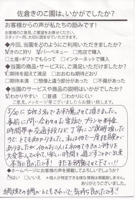 この度は、きのこ狩り&バーベキューでのご来園ありがとうございます。