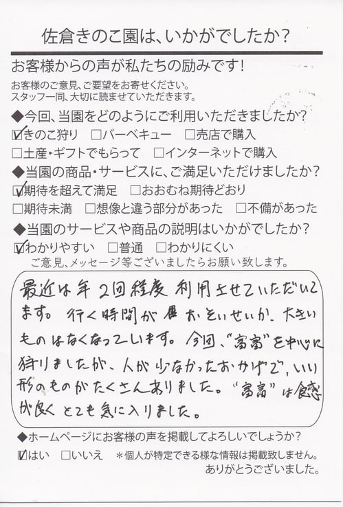 きのこ狩りは、開園直後から時間帯が早い方が大きいものが採れますので
