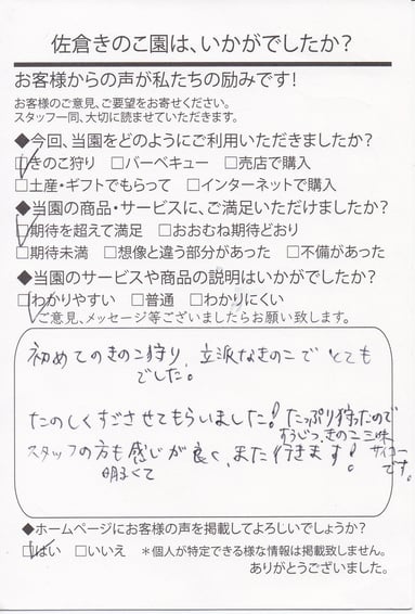 この度は、きのこ狩りでのご来園ありがとうございます。