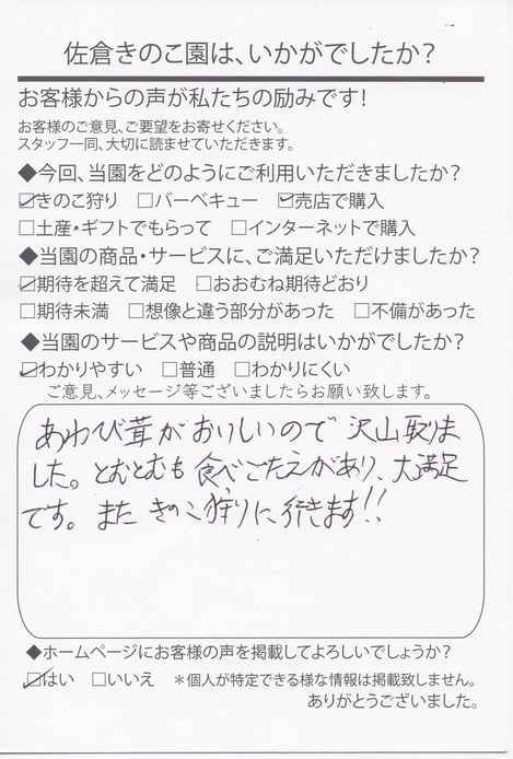 お客様の声 · 2025/02/28 大満足です。またきのこ狩りに行きます!! 美味しかったと言っていただけると、本当に励みになります。 また、きのこ狩りに来ていただけるとのこと、スタッフ一同楽しみにしております。 次回もたくさん採って、存分に楽しんでくださいね。 tagPlaceholderカテゴリ: