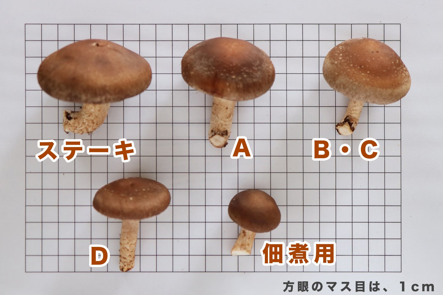 【形状】肉厚、正形でカサがあまり開いていないもの、大きさを揃えて納品