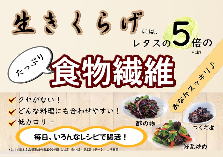 ※干しきくらげ2~3枚で5g(完全に戻ると約50g)相当になります。かなり膨らみますのでご注意下さい